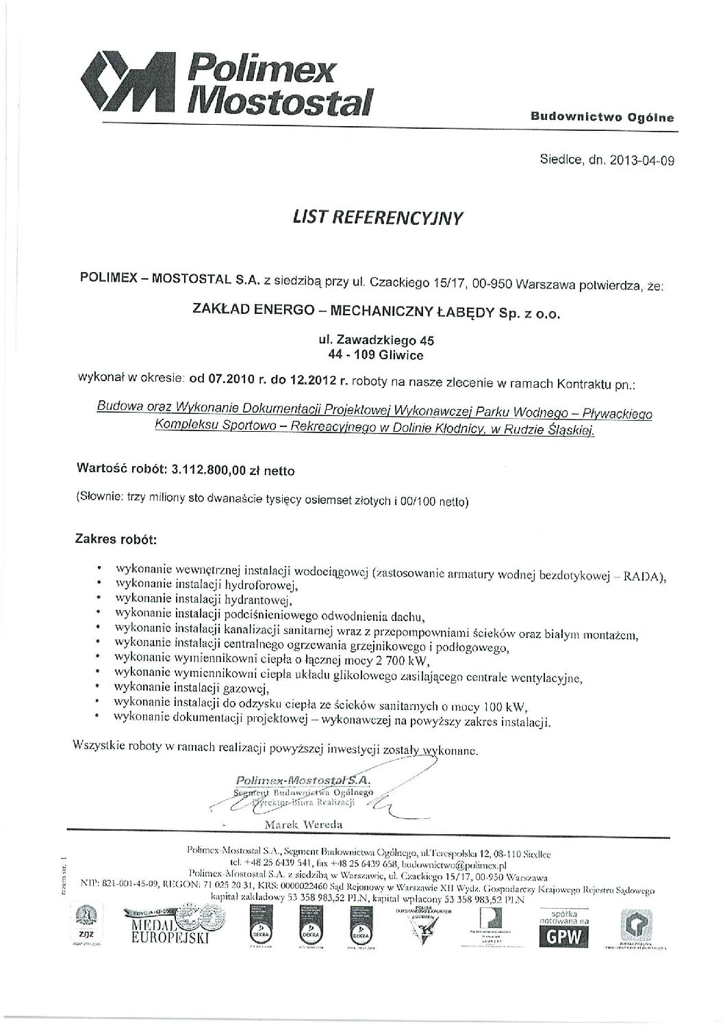 Generalnym Wykonawcą był Polimex Mostostal Siedlce.