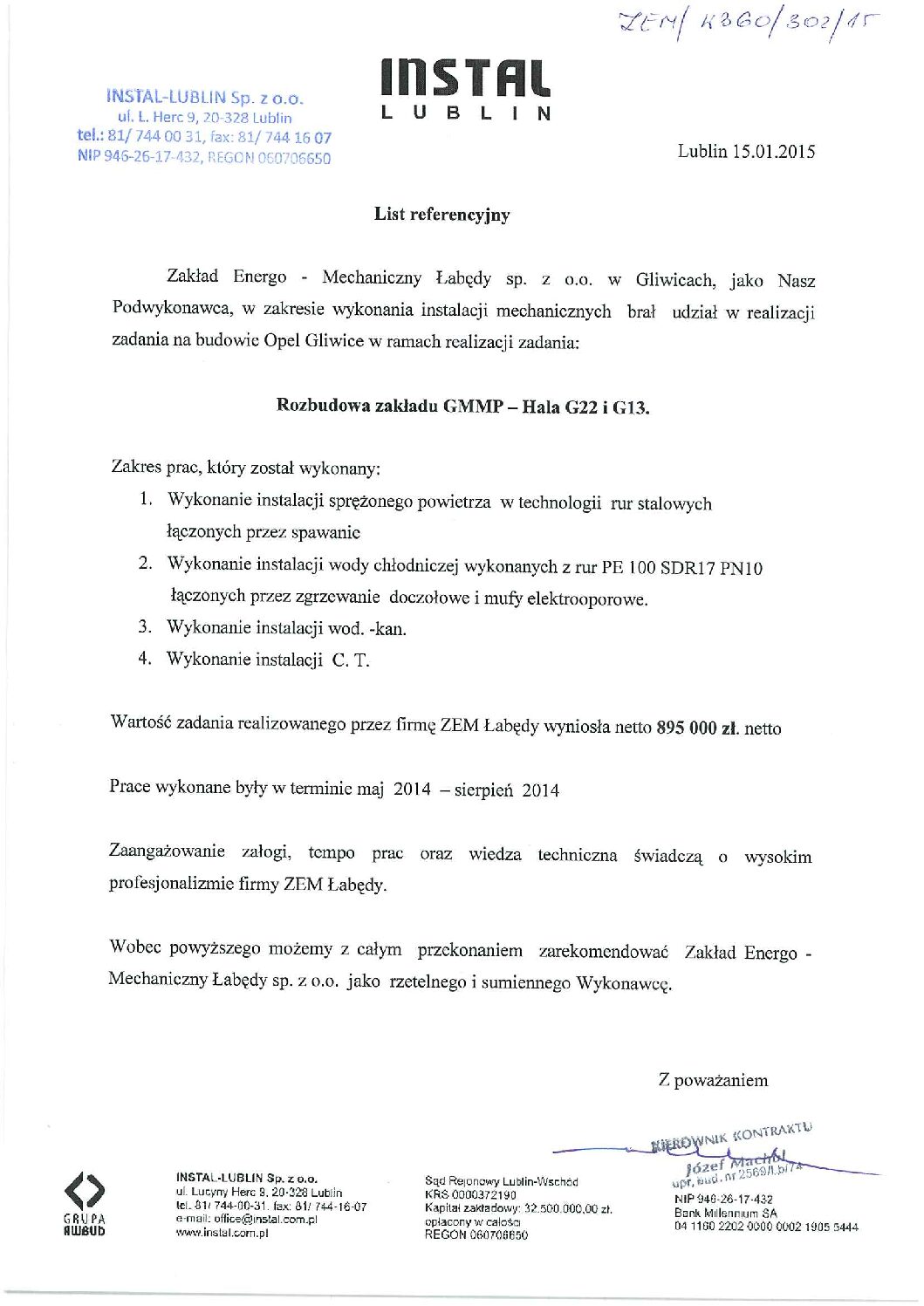 Dla zlecającego Instal Lublin wykonaliśmy montaż instalacje chłodnicze i sprężonego powietrza oraz instalacje Ciepła technologicznego oraz wodno -kanalizacyjne w nowobudowanych halach zakładu General Motors Opel Polska w Gliwicach